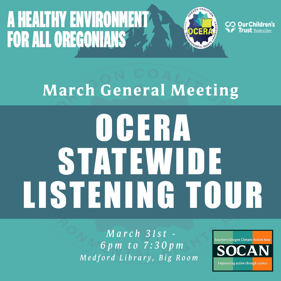 SOCAN’s March General Meeting will be structured as a listening session focused on the Oregon Environmental Rights Amendment (OCERA) and its relevance to climate action. Rather than a traditional lecture, this gathering will center community voices, questions, and concerns about what environmental rights mean in practice and how constitutional protections could shape climate policy, accountability, and long-term stewardship. The session is designed to inform future advocacy while ensuring community perspectives help guide the conversation.