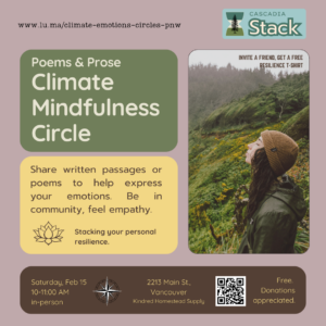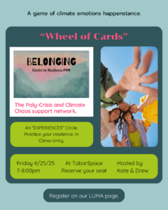 We provide peer support gatherings and seek collaborations. Coming to terms with personal feelings about the true crisis of climate change may lead participants to find a path to take meaningful collective action. We hold Climate Mindfulness Circles meetings online and occasionally in person, at least 3 times each month.